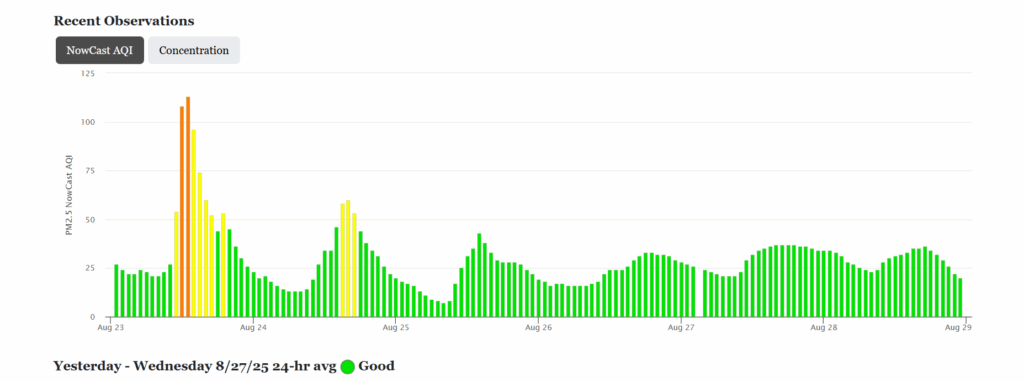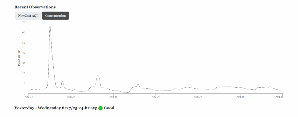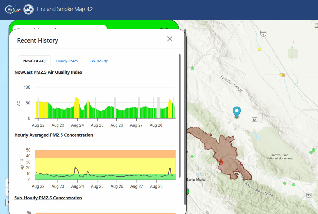 The EPA’s website gives you not just air quality but also charts ongoing AQI and PM2.5. The below information is from the reference station in Calistoga. This tracks air quality from the start of the fire onwards.