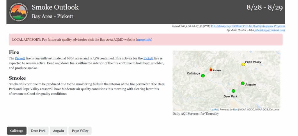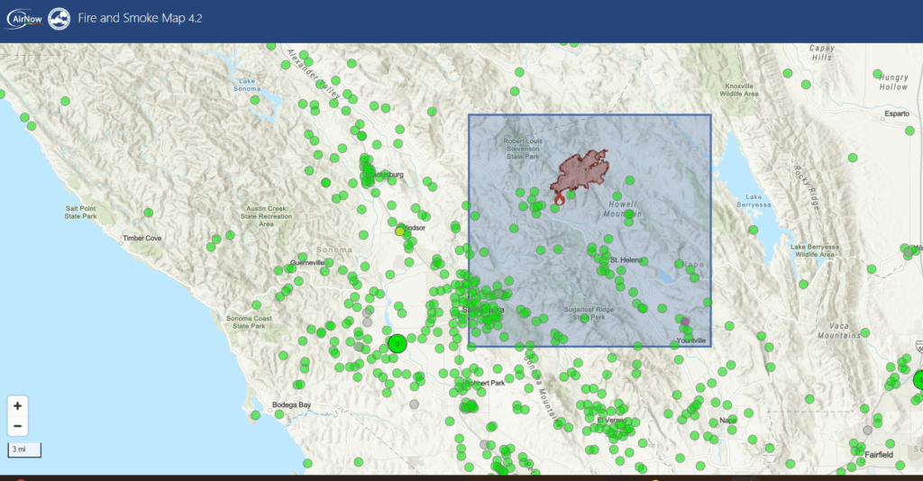 They also display information from the Interagency Wildland Fire Air Quality Response Program, which gives information specific to any given fire. Below we have the areas affected by the Pickett Fire in Calistoga, Deer Park, Angwin, and Pope Valley.